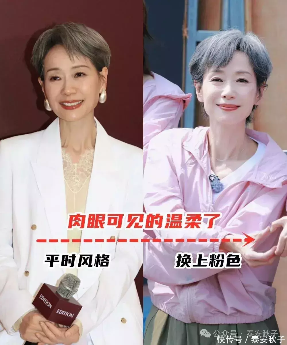 你看叶童,将干练的白色西装,换成了质地上乘的粉色衣服,整个人的状态像似年轻了十岁!