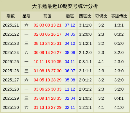后区分析:上期开出“小+大”、“偶+奇”的奖号:02、11,近10期后区的大小比为11:9,奇偶比为8:12,本期关注开出小+小、奇+偶的形态号码:01,04。